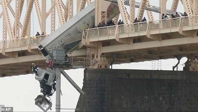 Dramatic dashcam footage has captured the moment a semi-truck driver was left hanging over the Ohio River.